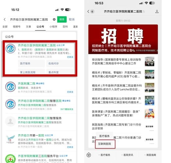 1、关注齐齐哈尔医学院附属第二医院微信公众号,选择【医疗服务】→【互联网医院】,进入互联网医院小程序。