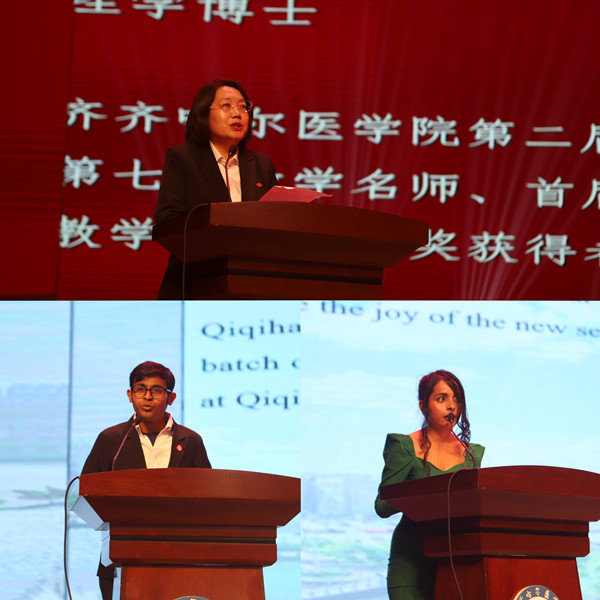药学院药理教研室洪博教授代表留学生授课教师发言,她分享了自己的求学和人生经验,鼓励留学生们奋发学习,不负家人的期望,为人类医疗卫生健康事业做贡献。来自印度的在校生代表比昂(Binang)和尼泊尔新生代表苏巴尼(Shubhani)分别用流利的中文发言,表达了对学院领导、老师和家人对自己关心支持的感谢,表示要努力学习、互帮互助,并祝愿齐医的明天更加灿烂辉煌。