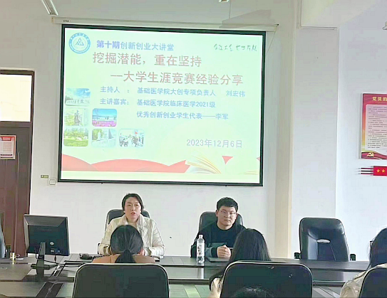 为促进学院学风建设的持续深入开展,围绕学生创新创业的发展需求,加强医学生对学科赛事、创新创业相关竞赛的理解,帮助同学们做好生涯规划和相关赛事准备,2023年12月6日,基础医学院于南区350会议室开展了第十期创新创业大讲堂。本次活动由基础医学院学生工作办公室刘宏伟老师主持,邀请临床医学2021级优秀创新创业学生代表李军同学围绕“挖掘潜能,重在坚持--大学生涯竞赛经验分享”主题为30余名学生进行分享。