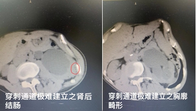 患者男,68岁,因儿时外伤致脊柱侧弯扭曲、胸廓畸形60年,患者半年前因腰部不适查出输尿管结石,并于外院手术治疗,因脊柱侧弯、胸廓畸形,PCNL穿刺风险极高,对肠管及胸腔损伤风险大,遂进行输尿管软镜手术治疗,术中因输尿管扭曲,手术失败。来到齐医附属二院后,王立鹤主任团队立即收集病史、病例讨论,多学科会诊,最终为患者制定手术方案:一期行超微通道经皮肾穿刺置管引流肾盂腔的脓性尿液;二期行微通道经皮肾镜钬激光碎石取石术。