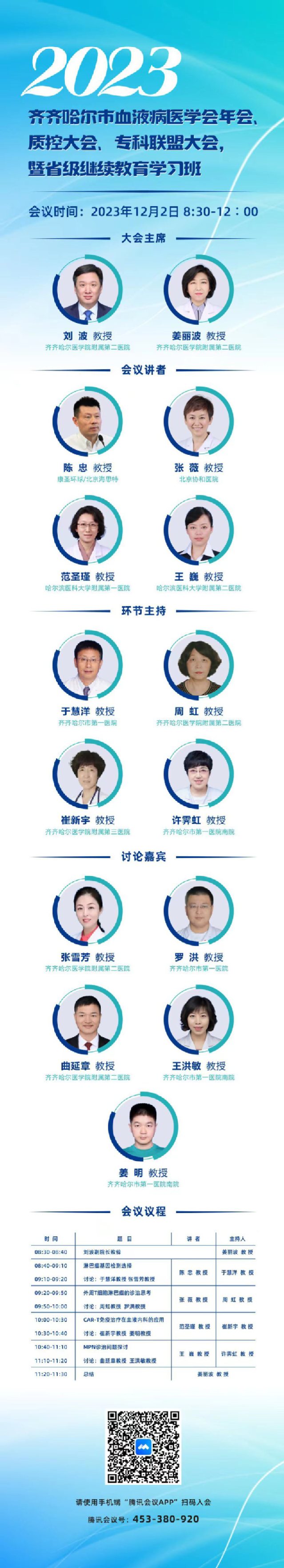 12月2日,齐医附属二院成功承办线上市血液病年会、质控大会、专科联盟大会暨省级继续教育学习班。副院长刘波致辞,市医学会血液病专业委员会主任委员、市血液病质控主任、专科联盟主席、血液风湿内科二病区主任姜丽波教授作总结,北京协和医院张薇教授、康圣环球、北京海思特医学检验实验室陈忠教授、哈医大附属第一医院范圣瑾教授、哈医大附属第二医院王巍教授作专题讲座,齐医附属二院周虹教授、齐医附属三院崔新宇教授、齐市第一医院于慧洋教授、齐市第一医院南院许霁虹教授出席大会并作环节主持,来自全市血液病同仁参加了本次线上学术会议。