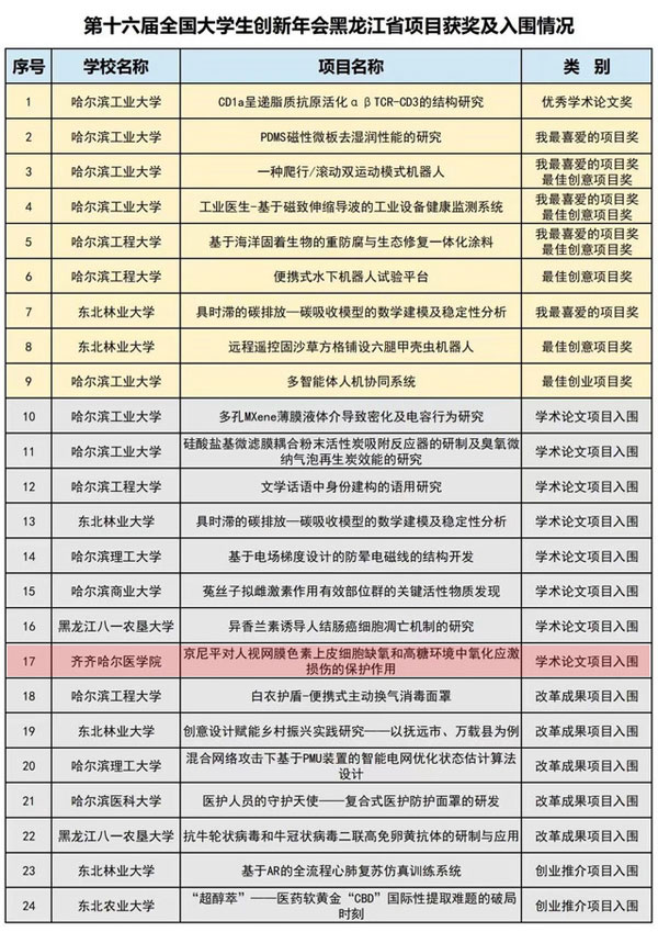 全国大学生创新年会是由教育部支持,国家级大学生创新创业训练计划专家组主办,依托“大学生创新创业训练计划”开展的一项重要年度性展示交流活动,是全国高校本科教学改革中覆盖面最广、影响力最大、学生参与最多、水平最高的盛会之一。我院学生的大创项目成果经过学院推荐、黑龙江省教育厅评选推荐、国家相关学科专家初评、“国创计划”专家工作组复选,从全国30个省、市、自治区推荐的347篇论文中脱颖而出,入围年会。此次黑龙江省共有7所高校的9项学术论文入围年会,学院是首次入围全国创新年会,也是省内学术论文项目类唯一入围的医学院校。学院的学术交流项目得到了黑龙江省教育厅领导的支持和认可。