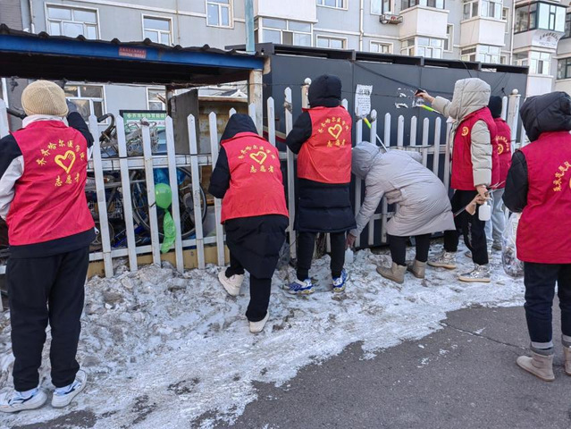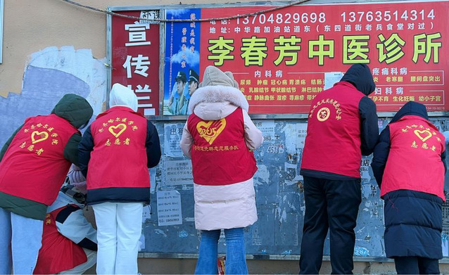 活动中,志愿者分成4组,对鑫海社区所辖范围内楼宇墙面、路灯杆等小广告彻底清理,同时对主要路面的积雪和垃圾进行彻底清扫。