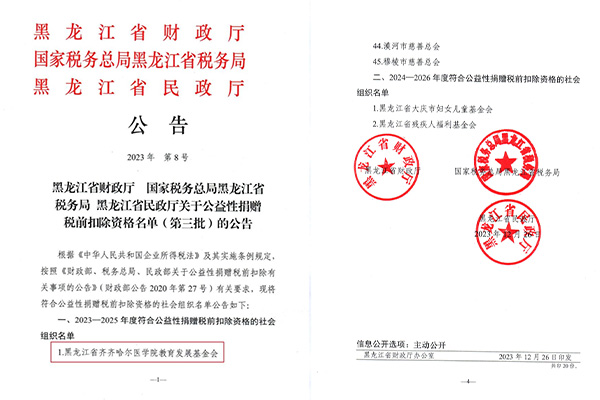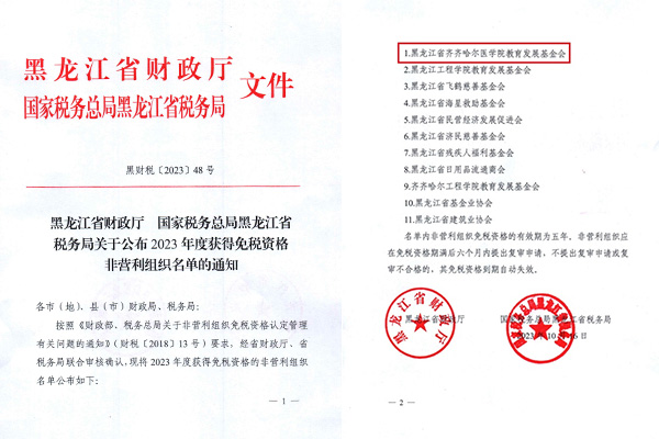 2023年,学院教育发展基金会按照国家财政部、税务总局《关于非营利组织免税资格认定管理有关问题的通知》要求,积极准备材料向省税务局申报,经省税务局、省财政厅联合审核并通过确认,学院教育发展基金会获得2023年度非营利组织免税资格,有效期为五年。在此基础上,根据《中华人民共和国企业所得税法》及其实施条例规定,按照《财政部、税务总局、民政部关于公益性捐赠税前扣除有关事项的公告》要求,学院提交了相关申请材料,经省财政厅、国家税务总局黑龙江省税务局、省民政厅联合审核并通过确认,学院教育发展基金会获得2023—2025年度公益性捐赠税前扣除资格,有效期三年。这两项“资格”的获得有助于进一步鼓励引导社会各方力量积极参与到学院公益慈善教育事业中来,增强了教育事业的资金来源和社会支持。