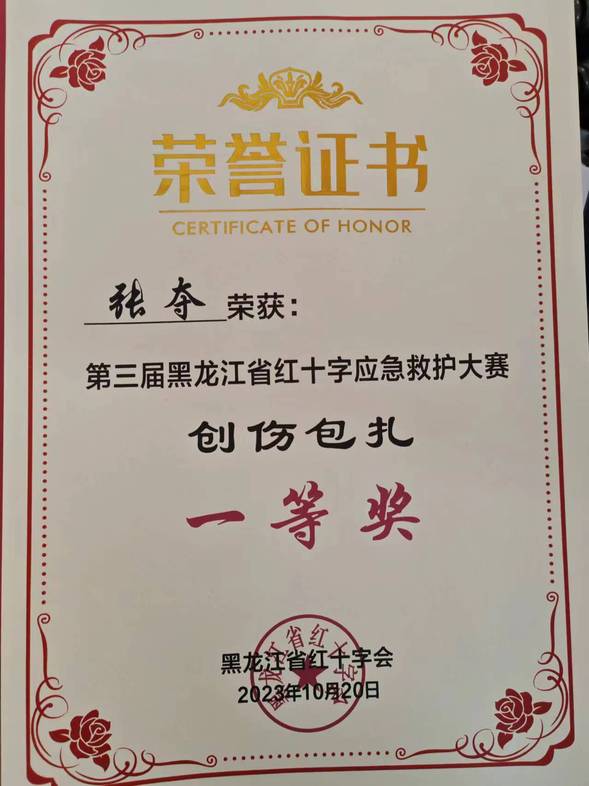 护士张夺在黑龙江省第二届红十字应急救护大赛中获团体二等奖、个人创伤包扎一等奖