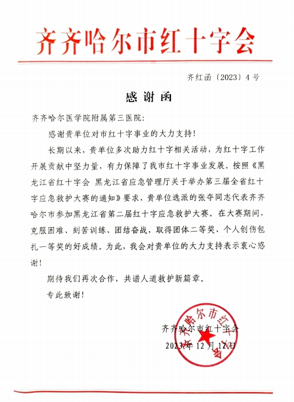 除了在院内定期开展培训和考核,我院护理部还积极组织护理人员参加社会各类护理实践操作比赛。今年8月,我院护士张书涵在黑龙江省护理学会主办的“安采门诊 规范指引”2023黑龙江省护理门诊安全采血活动中荣获优秀奖。9月,我院选派护士张夺代表齐齐哈尔市参加黑龙江省第二届红十字应急救护大赛。在大赛期间,她克服困难、刻苦训练、团结奋战,取得了团体二等奖、个人创伤包扎一等奖的好成绩,市红十字会特致感谢函,为我院对大赛的大力支持和参赛选手张夺的辛勤付出表示感谢。张夺表示,经过38天的严格训练,自己收获颇丰,也发现了不足,今后争取再创佳绩,为院增光。