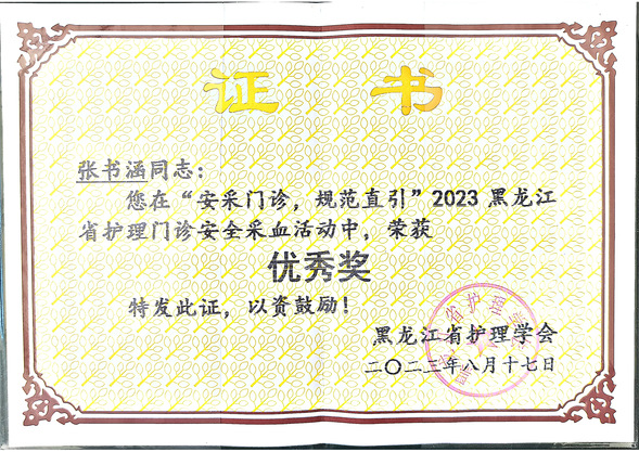 护士张书涵在“安采门诊 规范指引”2023黑龙江省护理门诊安全采血活动中获优秀奖