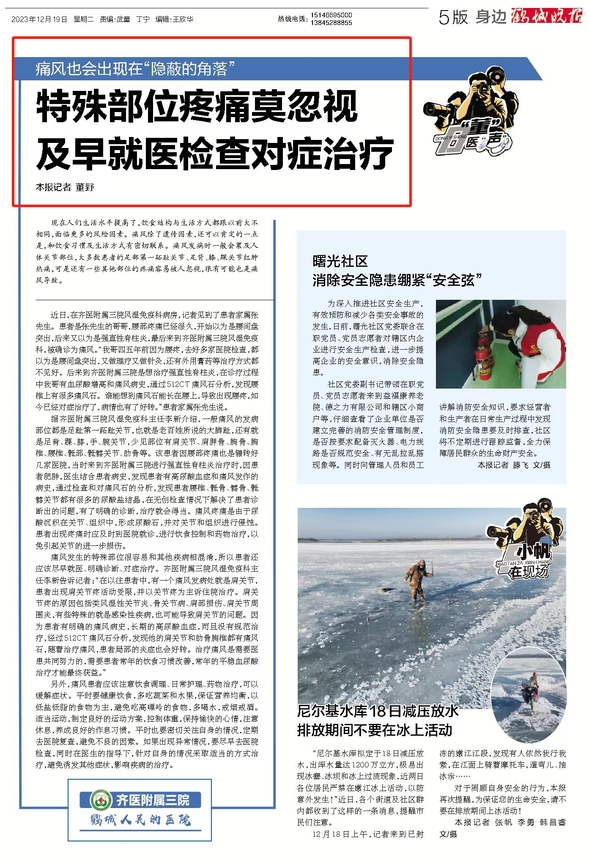 近日,在我院风湿免疫科病房,记者见到了患者家属张先生并向其了解到,患者是张先生的哥哥,腰部疼痛已经很久,开始的时候以为是腰间盘突出,后来又以为是强直性脊柱炎,最后来到齐医附属三院免疫科,并被确诊为痛风。“我哥四五年前因为腰疼,然后去好多家医院检查,都以为是腰间盘突出,又做理疗、又做针灸,还有外用膏药等治疗方式都不见好。后来到齐医附属三院是想治疗强直性脊柱炎,在诊疗过程中我哥有血尿酸增高和痛风病史,通过512CT痛风石分析,发现腰椎上有很多痛风石。谁能想到痛风石能长在腰上,导致出现腰疼,如今已经症治疗了,病情也有好转了。”患者家属张先生说道。