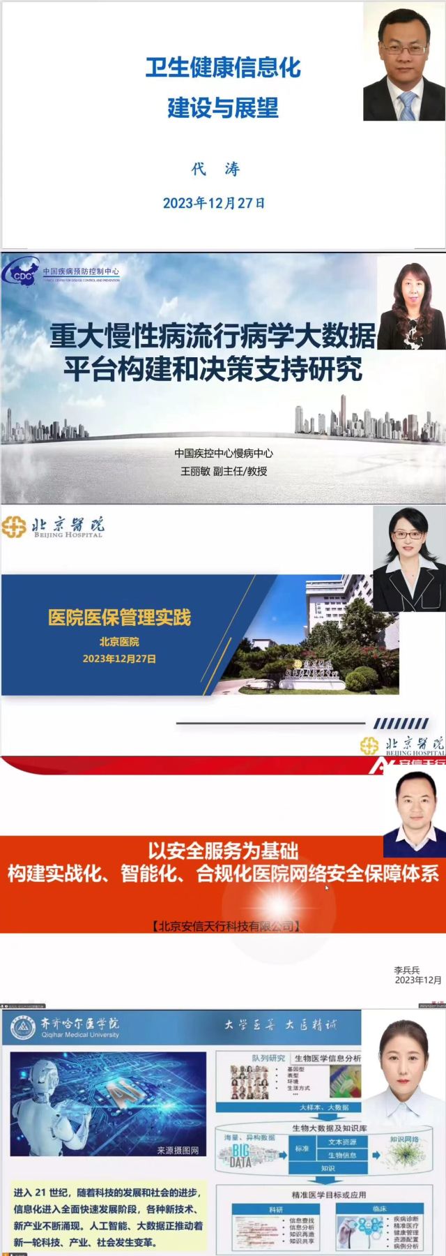 成立大会后,国家卫生健康委统计信息中心党委副书记代涛研究员、中国疾病预防控制中心慢性非传染性疾病预防控制中心副主任王丽敏教授、北京医院医疗保险管理处张群处长、北京安信天行科技有限公司卫生行业咨询部李伟昌经理、齐齐哈尔医学院公共卫生学院副院长白丽教授进行线上学术讲座,结合各自的研究领域进行了经验分享。