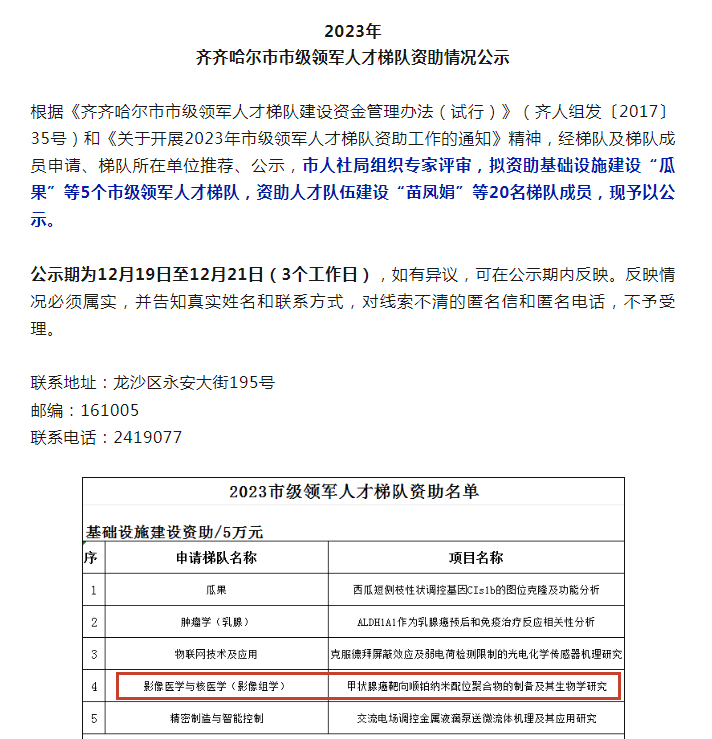2023年12月19日,齐齐哈尔市人力资源和社会保障局发布《2023年齐齐哈尔市市级领军人才梯队资助情况公示》,齐医附属一院影像医学与核医学(影像组学)梯队获批基础设施建设资助,资助经费5.0万元。