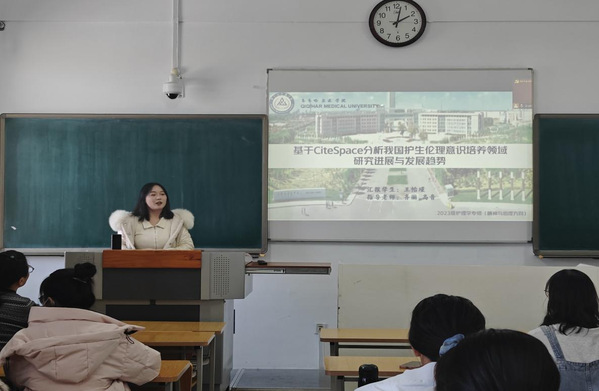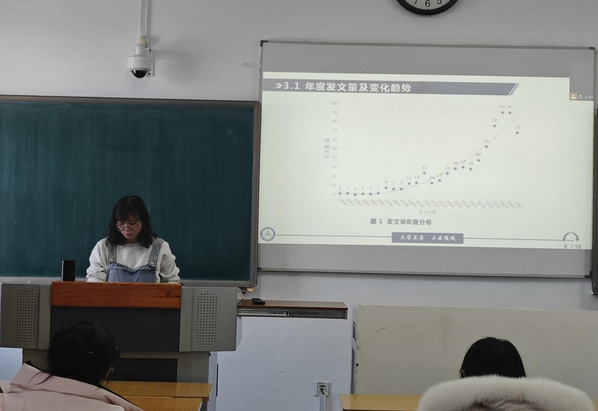 王怡瑾以《基于CiteSpace分析我国护生伦理意识培养领域研究进展与发展趋势》为题,讲解了基于CiteSpace软件,通过自动生成的知识图谱,对已发表的文献进行可视化分析,探讨我国护生伦理意识培养研究现状和发展趋势。张雁绚以《基于CiteSpace分析科研伦理审查的研究现状和发展趋势》为题,介绍了运用CiteSpace软件绘制文献关键词相关的网络图谱,探寻科研伦理审查领域的研究现状、研究热点及未来趋势。两位同学汇报后,全体研究生积极参与交流。齐丽教授从选题依据、数据选择、软件操作、文献内容等方面进行了详细点评,并建议大家阅读文献时要学会抓关键的科研问题,遵循文献阅读的目的性和实用性,深挖文献里的知识和内容,认真规划自己的研究课题。