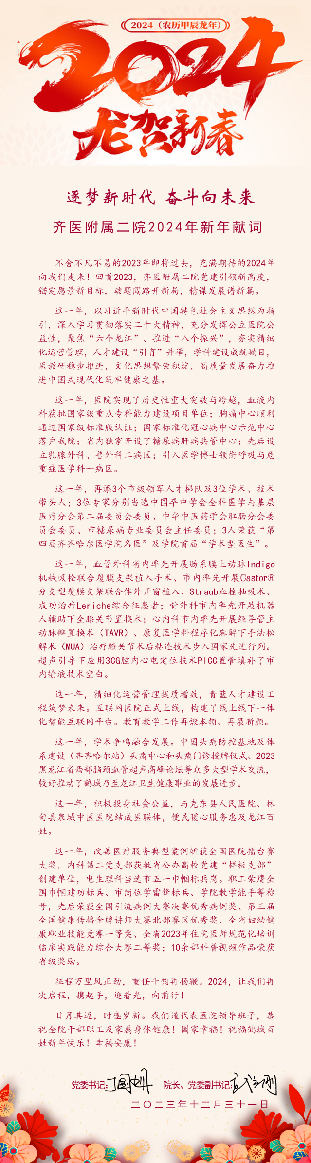 【附属二院】【恭贺新年】逐梦新时代 奋斗向未来—齐医附属二院2024年新年献词