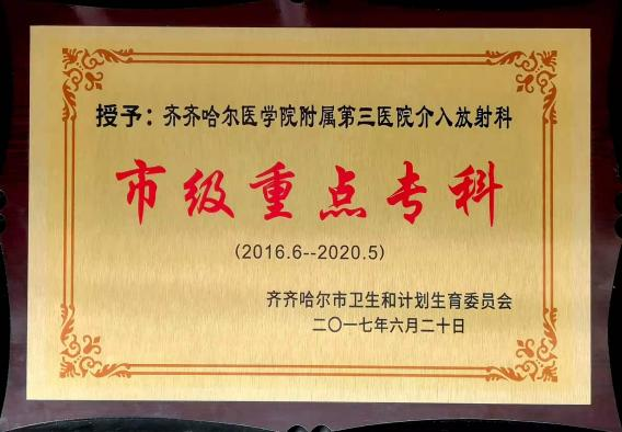 齐医附属三院介入科成立于1986年,是黑龙江省发展最早的介入专科之一。随着全国介入水平的不断提高,我院介入科也有十分显著的发展,治疗方法全面、多样,疾病处理办法、治疗理念领先国内大医院水平。至今已完成手术一万余台。2016年被评为市级重点专科。2017年被聘为黑龙江省医学影像专科联盟成员单位。2018年被聘为黑龙江省肿瘤介入专科联盟区域分中心。目前科内能开展的手术及治疗的疾病有:肝癌、肺癌、肾癌、胃肠道肿瘤等各种恶性肿瘤的血管内介入治疗及肿瘤的射频消融、微波消融、碘125粒子植入治疗;肝、肾等实质脏器囊肿、脓肿微创介入穿刺引流;胆道系统炎症、急性胆囊炎、胆管炎、肿瘤、梗阻性黄疸、胆道、胆囊微创介入外引流,胆道、食道支架术;输卵管阻塞所至不孕症;股骨头无菌性坏死;咯血、消化道大出血、急诊止血、肝硬化门静脉高压TIPS手术;胃造瘘、肠梗阻导管植入;各占位性病变穿刺活检、穿刺定位,四肢血管狭窄成形术;神经介入包括:脑血管造影,急性脑梗死介入取栓术,脑动脉瘤介入栓塞,颈动脉、椎动脉、锁骨下动脉支架植入术;脑动脉瘤介入栓塞、脑血管畸形治疗等项手术。从手术难度及预后方面市内领先,危重患抢救成功率高。