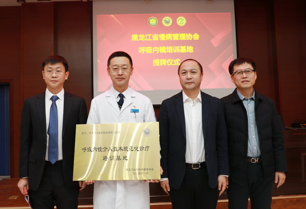 齐齐哈尔医学院附属第二医院被授予呼吸内镜介入技术规范化诊疗培训基地,武立刚院长、顾少岩博士代表医院上台接牌。