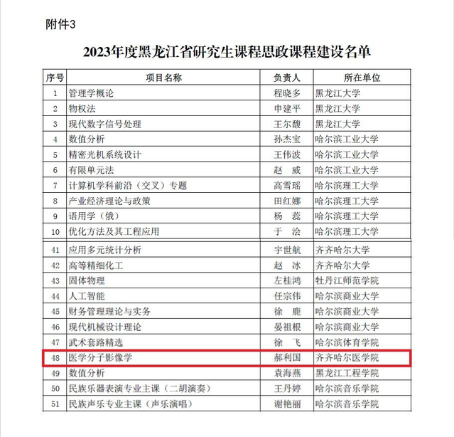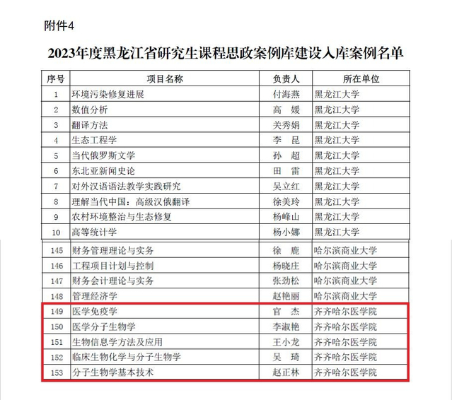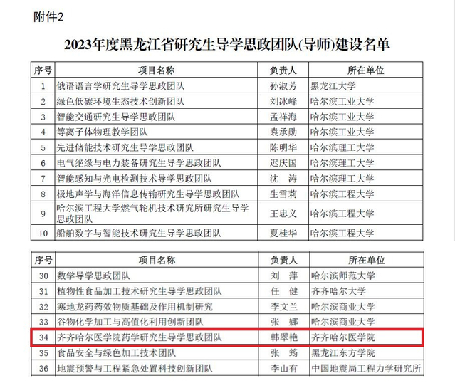 学院始终坚持立德树人根本任务,深化研究生教育教学改革,强化内涵建设,打造研究生精品课程。在此次评选中,药学院韩翠艳教授负责的“齐齐哈尔医学院药学研究生导学思政团队”获评黑龙江省研究生导学思政团队(导师)建设项目;医学技术学院郝利国教授的《医学分子影像学》课程获评黑龙江省研究生课程思政课程建设项目;医学技术学院官杰教授等5位老师的课程思政案例获评黑龙江省研究生课程思政案例库建设入库案例。