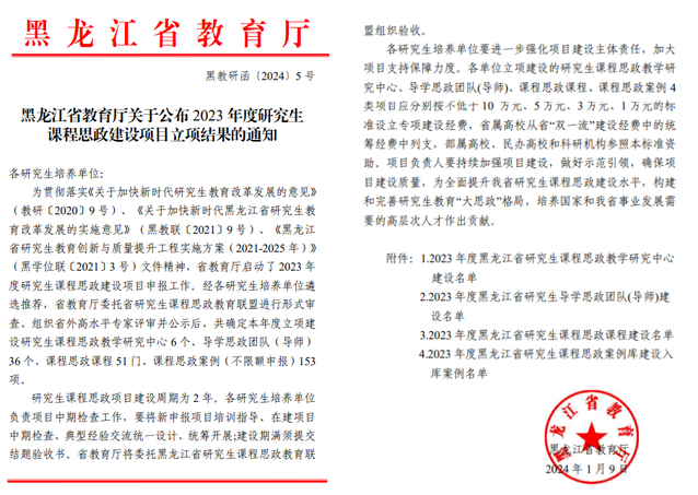 经全省研究生培养单位遴选推荐和专家评审,近日,2023 年度研究生课程思政建设项目立项结果公布,学院获评立项建设黑龙江省研究生导学思政团队(导师)1个、黑龙江省研究生课程思政课程1门、黑龙江省研究生课程思政案例5项。