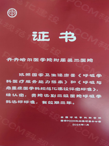 2024年1月13日,2024年度中国呼吸学科发展大会在北京召开,会上2023下半年呼吸与危重症医学科(简称PCCM科)规范化建设认定结果揭晓,齐齐哈尔医学院附属第二医院成功入选“国家呼吸与危重症医学科规范化建设三级医院达标单位”,这标志着齐医附属二院呼吸与危重症医学科建设已达到国家级标准化、规范化水平,救治与呼吸慢病防治能力迈进国家先进行列。