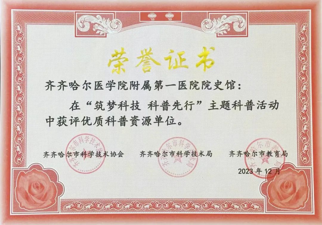 按照《齐齐哈尔市全民科学素质行动规划纲要实施方案(2022-2025年)》(齐政办发【2022】16号)“实施科技资源科普化工程”的要求,齐齐哈尔市科协、市科技局、市教育局联合开展2023年“筑梦科技 科普先行”主题科普活动,齐医附属一院院史馆科普教育基地积极参与,开展丰富多彩的活动,成绩效果显著,获评“筑梦科技 科普先行”主题科普活动优质科普资源单位称号。