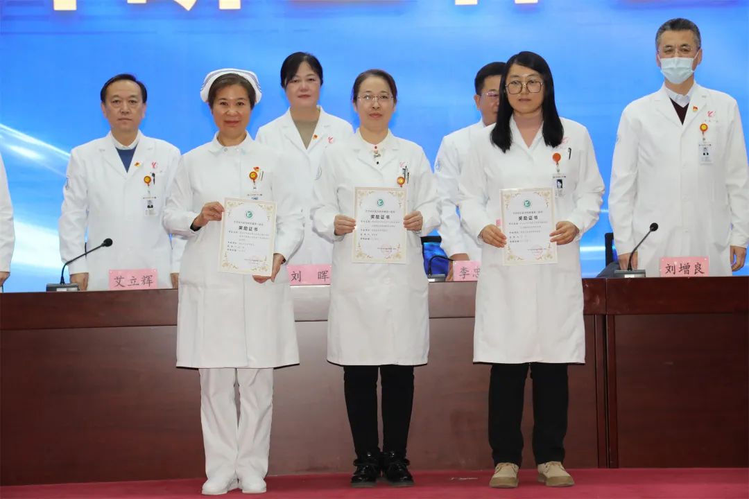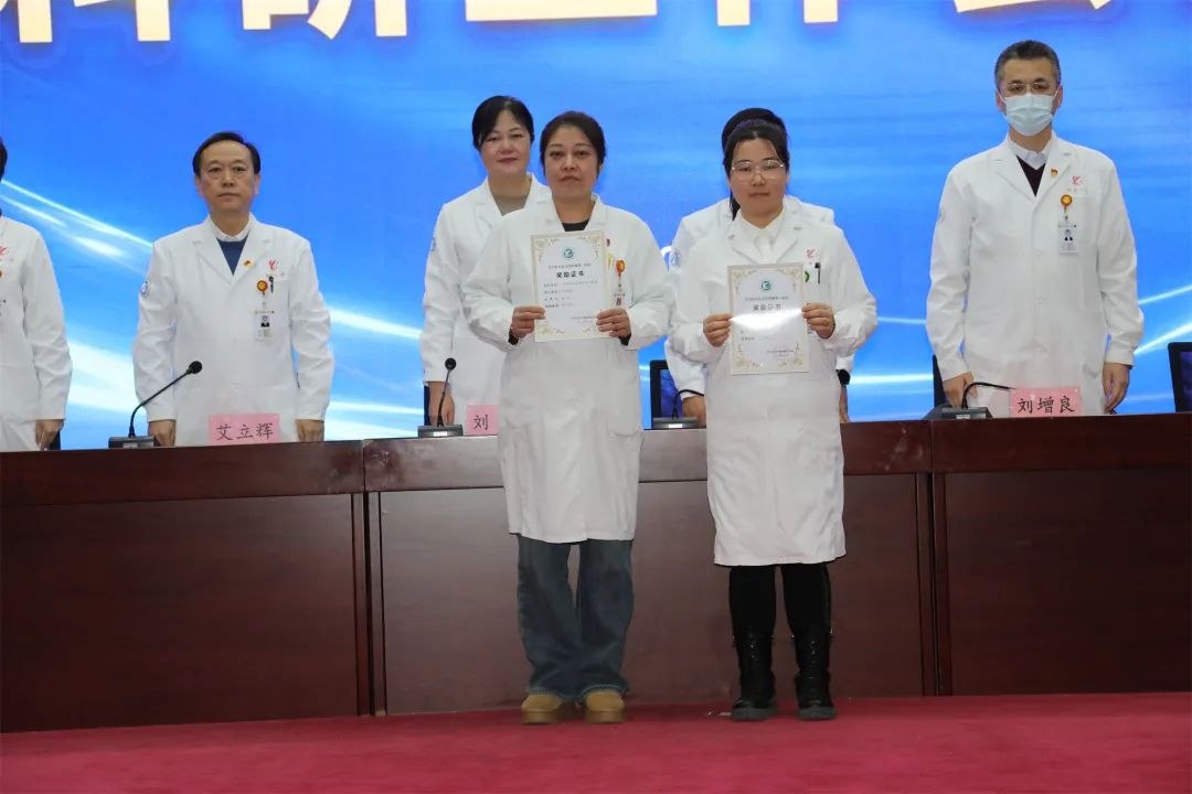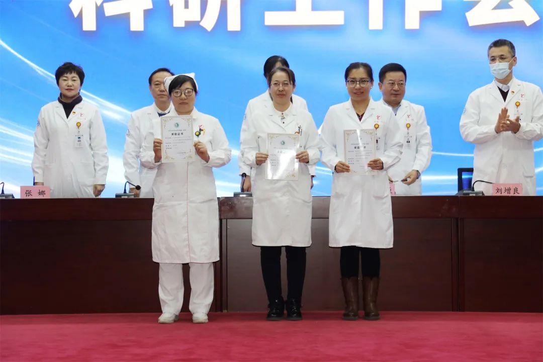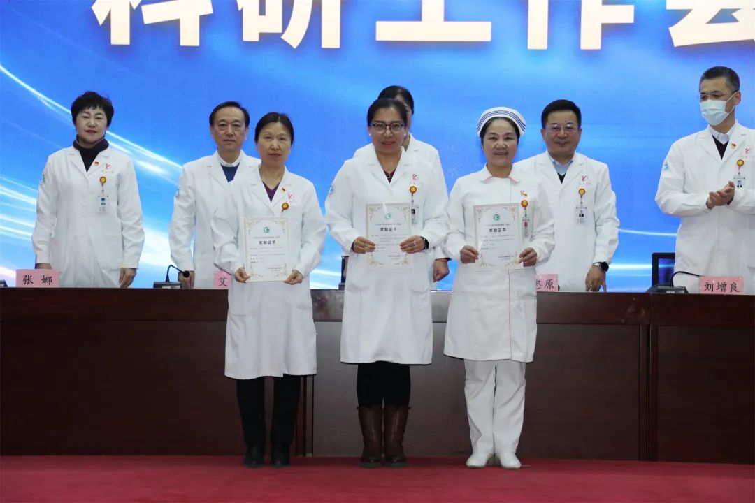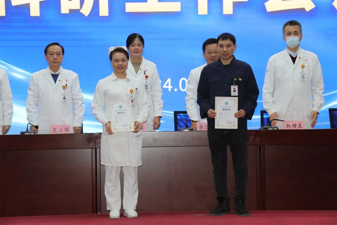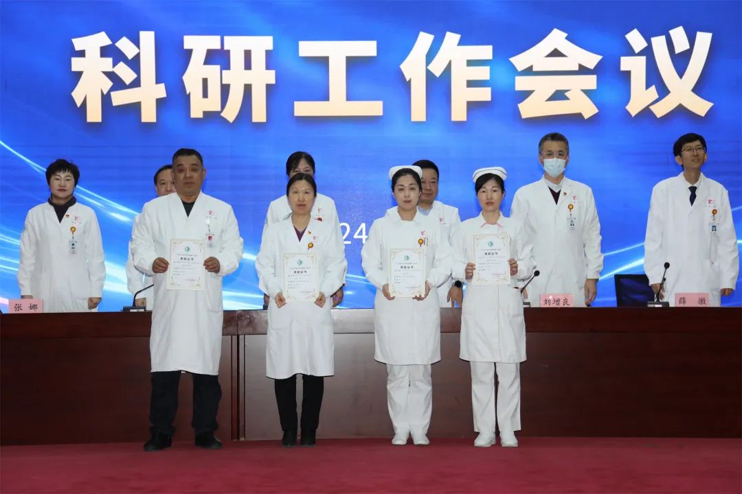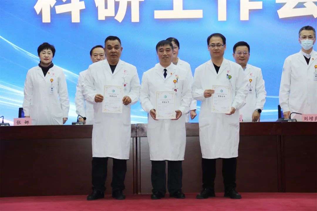 医院党委书记刘晖、副院长艾立辉、副院长刘增良分别宣读了《关于表彰奖励2023年度科研成果的通知》(院政发〔2024〕6号)《关于表彰奖励2022年度科研成果的通知》(院政发〔2024〕5号)《关于表彰奖励2021年度科研成果的通知》(院政发〔2024〕4号),并对李世玲等获奖人员代表进行了表彰。