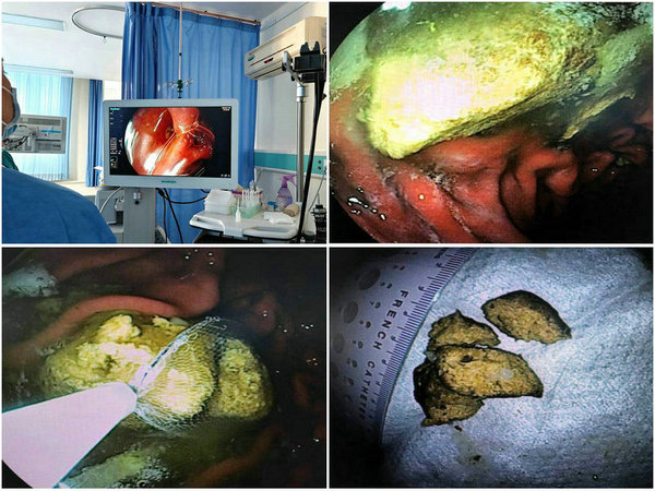 近日,56岁的张先生,因上腹痛、腹胀嗳气、恶心呕吐半月,来到齐医附属二院消化内科就诊,张巍副主任医师通过询问张先生病史得知,该患者长期上腹痛、恶心呕吐,但原因不明。经过张巍医生与患者家属充分沟通,同意进行电子胃镜观察。经过术前充分的准备,张巍医生在电子胃镜检查下,在患者胃内发现多处溃疡,并且发现多块胃石。该患者胃石较大、质地较硬,且幽门口较狭窄,不易进行药物治疗。经过与患者家属沟通,家属同意进行内镜下碎石取石。在张巍医生与护理团队的紧密配合下,将大块的胃石进行手法粉碎,继之利用网套取出,以防止因为胃石较大从而取出时发生贲门撕裂。整个碎石取石进行非常顺利,病人无不适症状,家属十分满意,目前病人已经出院。
