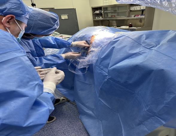 疼痛科医生王鑫凯、丛威亮为患者行鞘内输注系统植入术