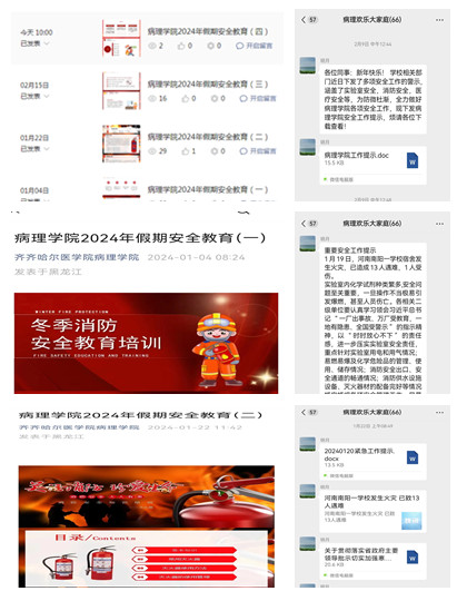 寒假期间,病理学院结合《齐齐哈尔医学院2023年今冬明春火灾防控工作方案》文件要求,于2月3日开展了春节前安全检查,对各房间区域电气线路、设备断电、门窗封闭等情况进行全面检查,同时针对实验室消防安全、实验设备运行及危险化学品储存等易产生安全隐患的重点环节进行了细致的排查。在开展隐患排查基础上,持续组织开展安全宣传教育工作,通过深入学习总结校发安全工作提示内容,于2月9日下发《病理学院安全工作提示》,要求各部门坚决落实校园安全工作部署,坚持底线思维,以“零容忍”态度做好各项安全生产工作。