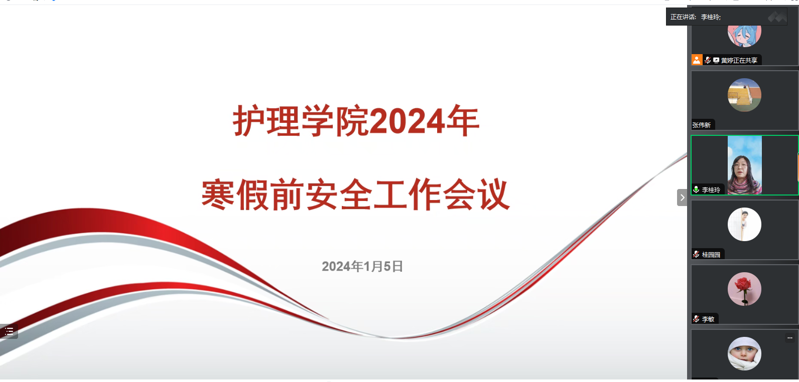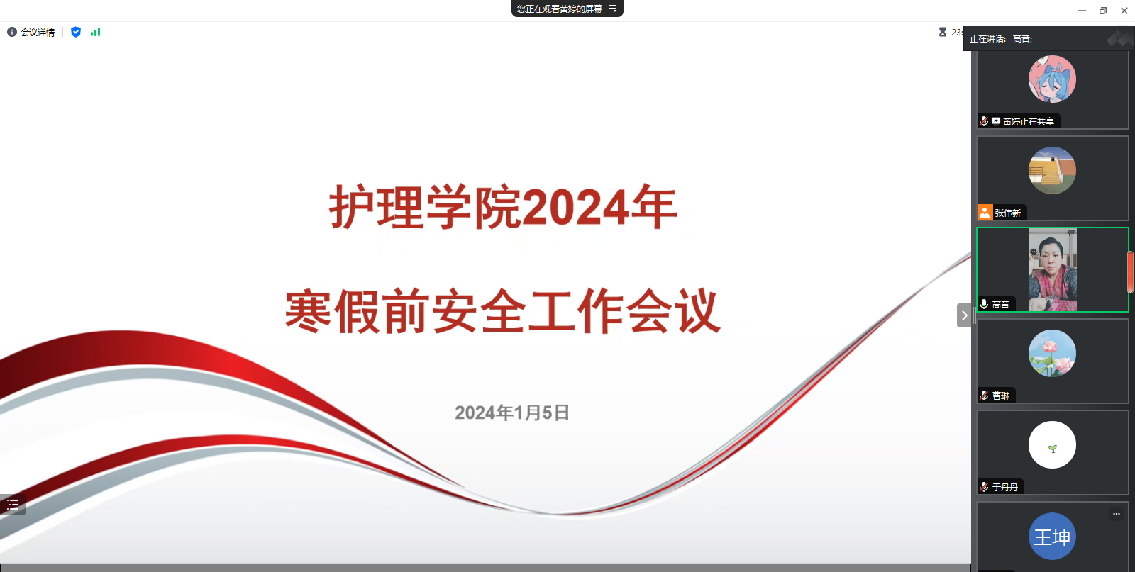 1月5日下午,护理学院在腾讯会议召开2024年假前安全工作会议。会议由护理学院院长高音主持。护理学院全体教职工参加会议。