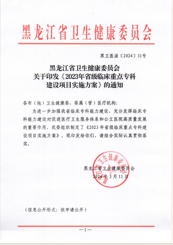 近日,黑龙江省卫生健康委员会发布了《关于印发<2023年省级临床重点专科建设项目实施方案>的通知》,我院心内科成功获批2023年度省级临床重点专科建设项目。这标志着我院心内科医疗水平、服务能力跻身省内一流行列,是我院学术型医院建设和高质量发展取得的又一标志性硕果。