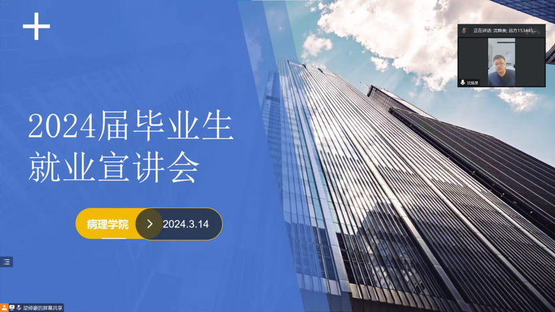 为进一步做好毕业生就业工作,帮助毕业生认清当前就业形势,树立正确的就业观和择业观,提升就业信心。3月14日晚,病理学院团总支结合“共青团促进大学生就业行动”安排部署,通过腾讯会议召开了“就业引航,共筑未来”2024届毕业生就业宣讲会,会议由病理学院党总支副书记沈焕泉主持,病理学院全体辅导员、2024届毕业生及家长参加了本次活动。
