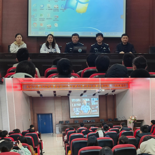 为帮助2025届毕业生对就业做到早了解、早准备,不断提升精神医学专业学生就业质量。3月20日上午,精神卫生学院联合附属第一医院、附属第二医院邀请北京市公安局监所管理总队政治处民警冯华林、郭宗保赴附属第二医院多功能厅召开招聘宣讲会,宣讲会由附属第二医院才艳雪科长主持,精神卫生学院党总支副书记刘兴来、辅导员郜莹,附属第一医院学生科长马鑫、附属第二医院辅导员陈宇博以及2020级精神医学专业全体学生参会。