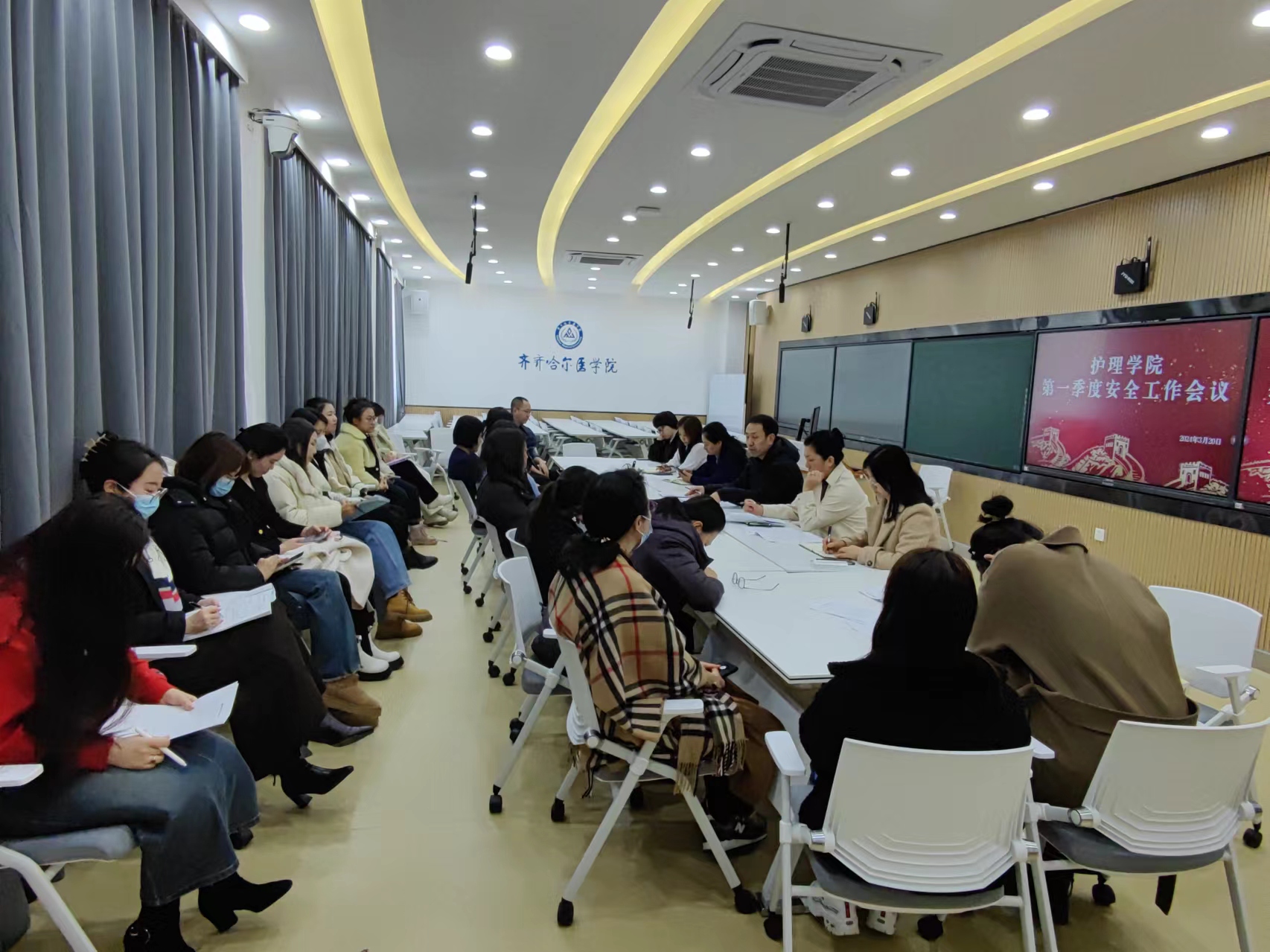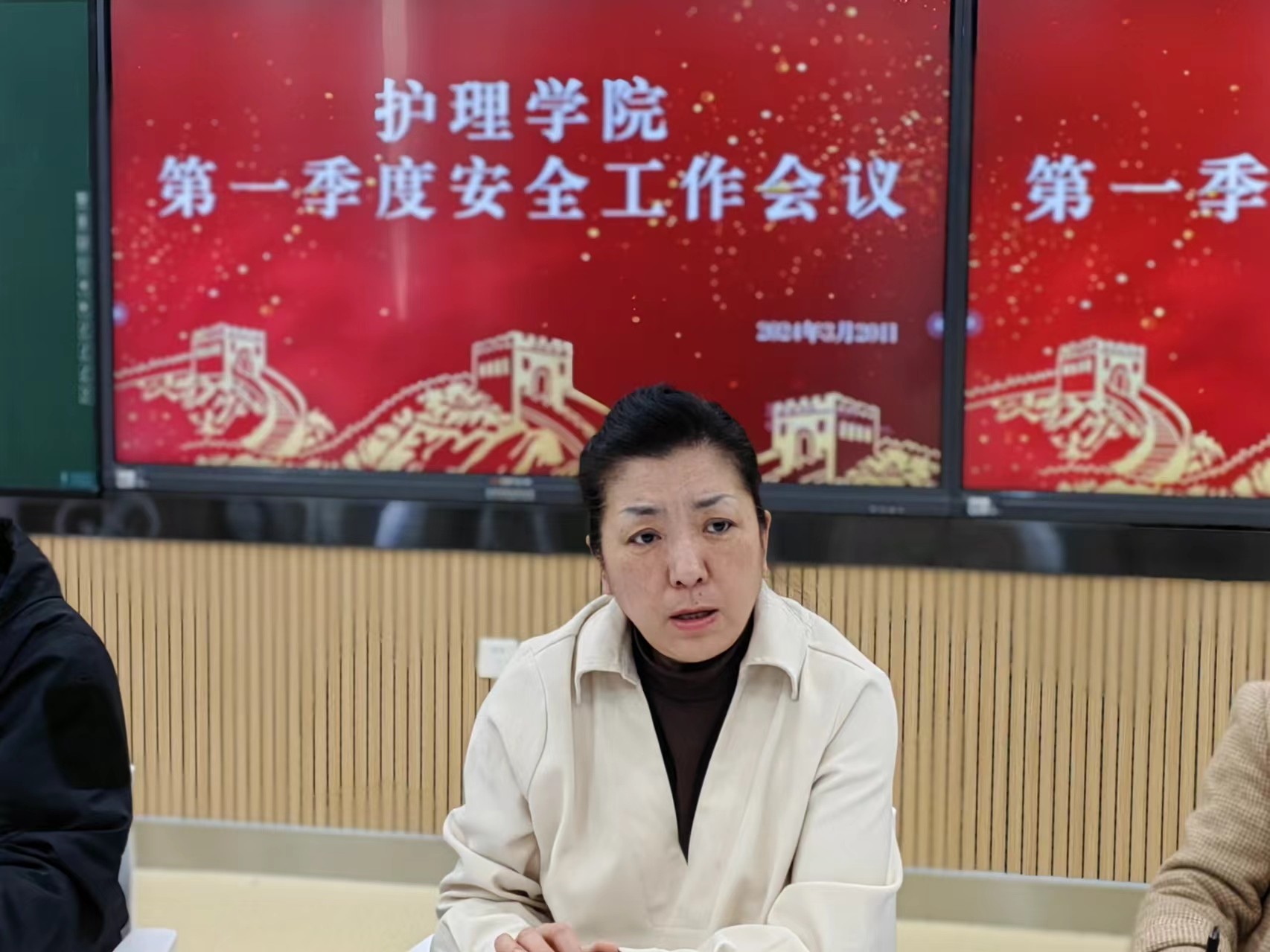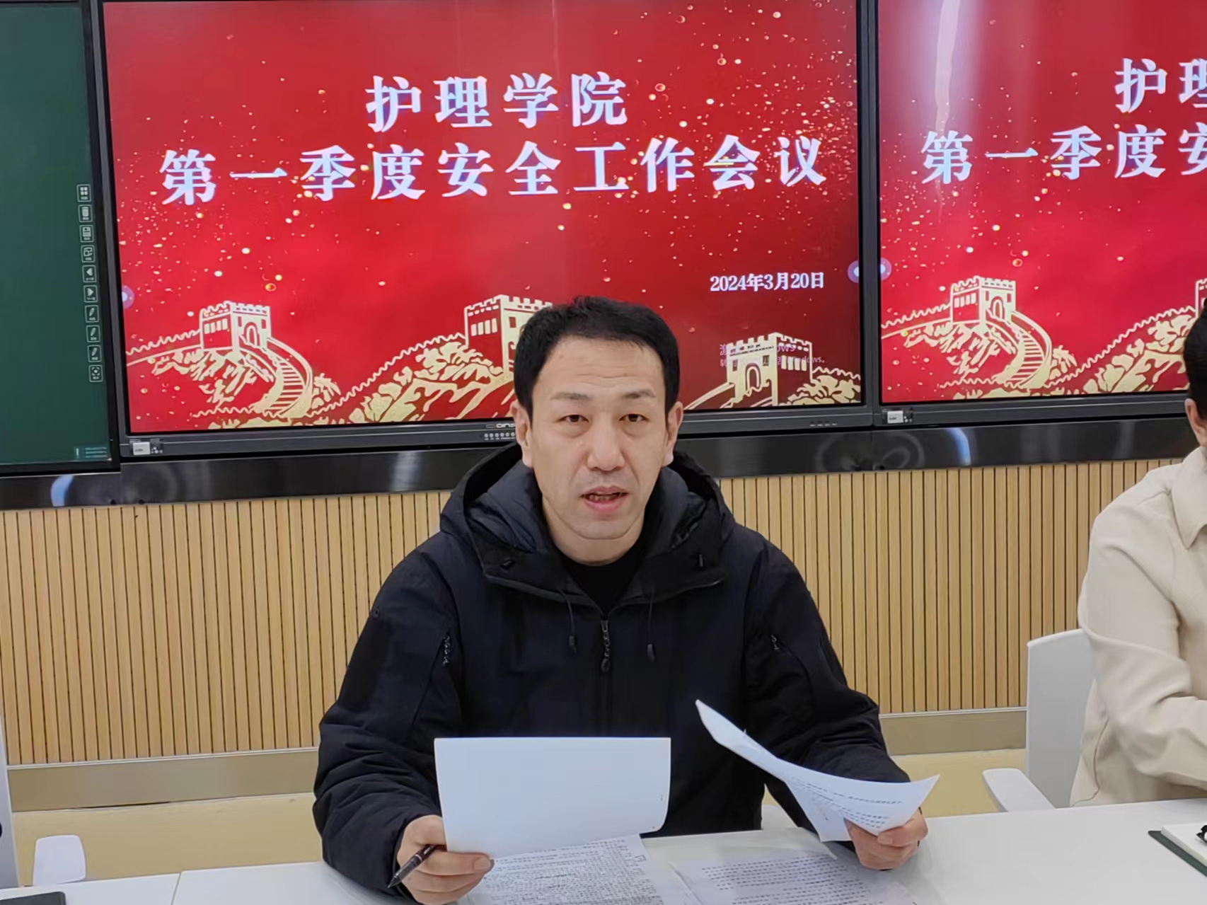 为贯彻落实上级关于加强安全工作重要部署要求及学院2024年安全工作会议精神,部署下一阶段安全工作,3月20日,护理学院召开2024年第一季度安全工作会议。护理学院党总支书记李强讲话。院长高音主持会议。全体教职工参加会议。