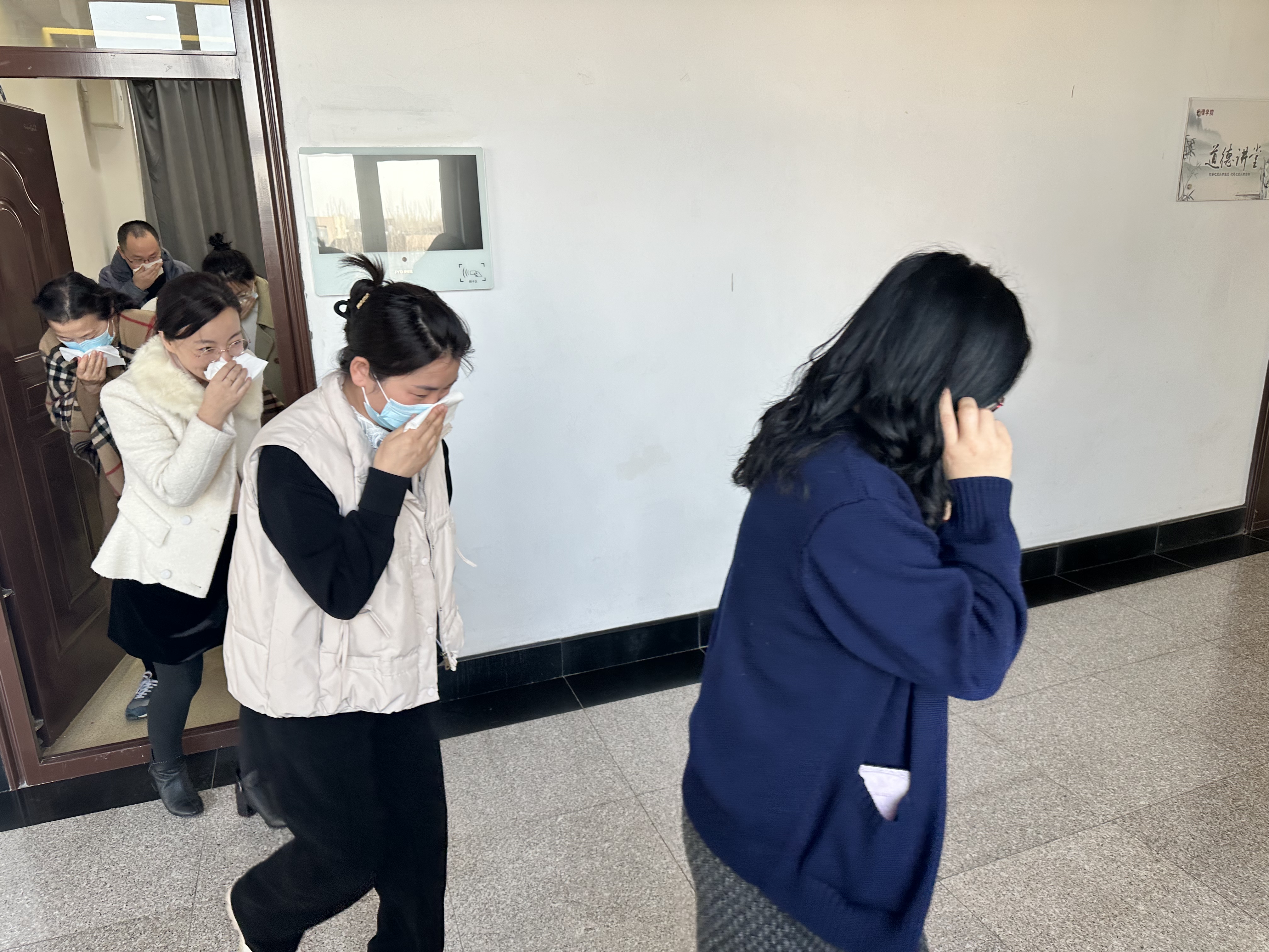 会后,与会师生模拟火灾现场开展应急逃生演练,用湿毛巾捂住口鼻,压低身体,有序地从消防通道撤离。