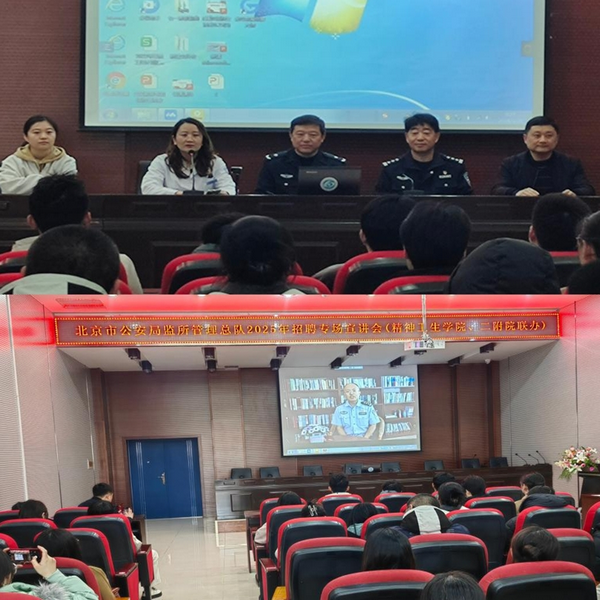 3月20日,齐医附属二院与精神卫生学院邀请北京市公安局监所管理总队政治处民警冯华林、郭宗保莅走进附属二院临床技能多功能厅,组织召开招聘宣讲会。学生科副科长才艳雪主持会议,精神卫生学院党总支副书记刘兴来、辅导员郜莹、附属二院辅导员陈宇博以及2020级精神医学专业全体学生参会。