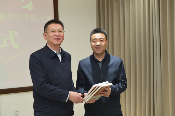 仪式上,张可勇介绍了学院坚持立德树人根本,积极发挥大学服务社会职能,探索通过“小手拉大手”结对共建模式,依托校园开放、社会实践、志愿服务、课程建设等形式,共同推进我市大中小学校思政课一体化建设,促进全市大中小学生德智体美劳全面发展的主要举措。刘伟对学院为中小学提供的优质资源深表感谢,希望通过本次共建深化合作,实现共赢。张可勇还代表学院向回民小学捐赠了《大医文化系列丛书》,希望孩子们接受大医文化熏陶,感受大学人文气息,埋下向往大学的种子。