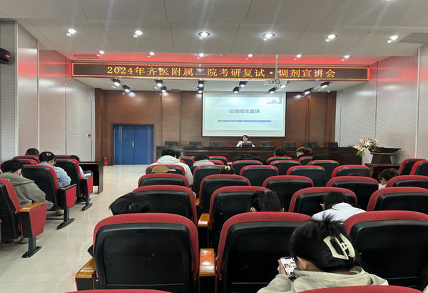 岳波主任对考研调剂的政策、调剂的注意事项、调剂平台、调剂具体操作等方面进行详细讲解;针对考研调剂方面,她向同学们介绍了近几年来考研调剂详细情况,面对考研形势逐年愈发严峻以及就业难的背景下,她表示,同学们要根据成绩做出判断,在有限的时间内,通过校内校外信息渠道收集更多调剂信息,不要盲目二战,珍惜每一个升学机会;岳波主任表示,欢迎同学们随时与他交流考研问题,一定会尽力为大家提供相关建议指引,帮助大家圆梦研究生。最后,岳波主任就齐齐哈尔医学院附属第二医院住培基地概况、住培制度、教学师资、培训效果、学员待遇及“两个同等对待”政策等方面向同学们进行讲解。宣讲会气氛热烈,医院完善的培训条件、雄厚的师资队伍、“以学员为中心”培训理念、优越的学员待遇引起了同学们浓厚的兴趣,给即将参加住培的同学们提供指导及建议,做好个人职业生涯规划工作。