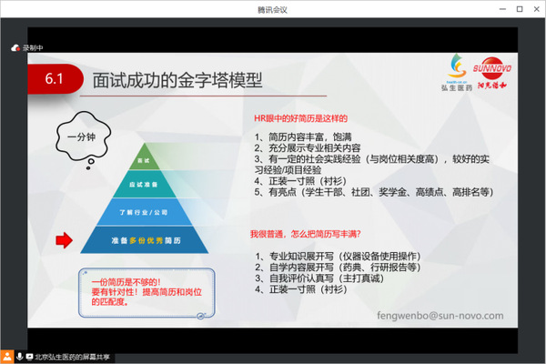 北京弘生医药科技有限公司人力资源总监冯文博从公司发展历程、企业文化、解读CRO行业、招聘岗位、薪酬福利等方面进行了详细的介绍。冯文博总监作为超级HR联盟导师,具有十余年国企咨询公司、上市公司HR经验,宣讲过程中以用人单位HR角度从职业生涯规划、面试技巧、简历制作三个方面对同学们进行了培训。