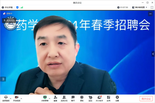 4月10日下午,药学院举办专场招聘宣讲会,北京弘生医药科技有限公司、普蕊斯(上海)医药科技开发股份有限公司参加宣讲。药学院党委书记丛凯、院长韩翠艳、党委副书记孔寰宇、毕业班辅导员董玉晶、李丹和2024届未落实工作毕业生参会。会议由学工办主任梁玉清主持。