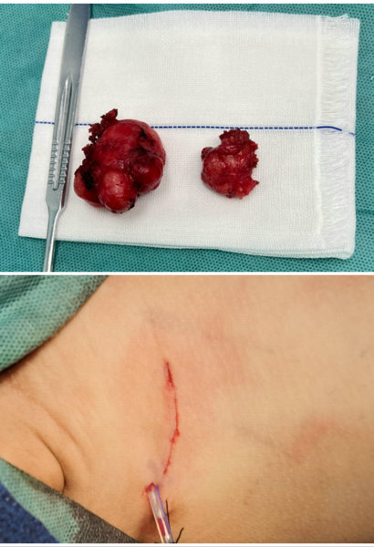 来自林甸县13岁的刘某某,因发现右侧乳腺肿物一年来齐医附属二院就诊,入院后进行相关检查,其右乳乳头上方及乳头后方多发肿物,乳头上方肿物较大,最大直径5cm,如行常规开放手术治疗,会在乳房表面就有较大疤痕,另外病人比较年轻,对自身乳房美观的要求强烈,经乳腺外科主任闫卫刚主任医师,李静龙主任医师及全体医护团队周密的术前分析及评估,拟采用目前国内先进的腔镜乳腺手术技术,在病人的腋下原有皮纹处行3cm切口,经腔镜下从乳腺后方将肿瘤切除术,从而将乳腺导管损伤几率降至最低的同时,保证了乳房的美观,手术过程非常顺利,术后病人乳房表面没有切口,切口隐藏在腋窝下方,既达到了治疗疾病的目的,也达到了患者美观及哺乳的要求。