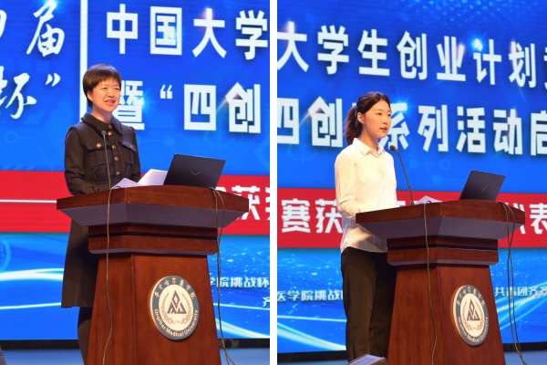 开幕式上,播放了本届挑战杯的宣传视频。基础医学院宋运娜老师作为往届国赛获奖项目指导教师代表发言;附属第一医院精神医学专业李紫睿作为往届省赛获奖项目学生代表发言。