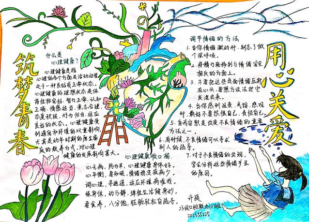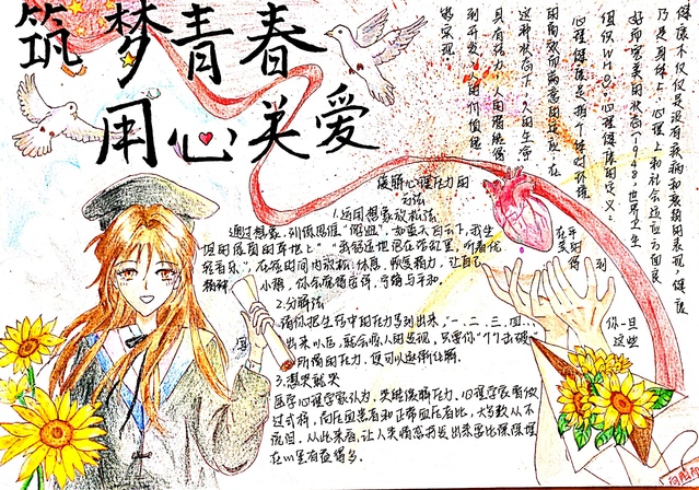 为了进一步宣传普及心理健康知识,营造良好校园心理健康教育氛围,促进学生的身心发展,塑造积极健康的阳光心态。近期,我院组织开展心理健康日系列活动——“筑梦青春 用心关爱”心理手抄报比赛,近百名学生参与此次活动。