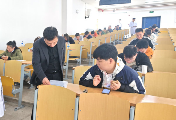 初试在省卫健委科教处统筹领导下,省医学教育考试中心统一安排下,设考务管理员,完成考场编排,保障考场内网络通畅,监考老师负责核验考生身份证、准考证,引导考生有序进入考场,考试前考务人员进行《考生须知》宣读,要求考生严格遵守考场纪律。理论考试由省卫健委统一组织使用“人卫助手”APP进行,副院长刘波亲自到考场巡考,对考试实施情况进行督查。
