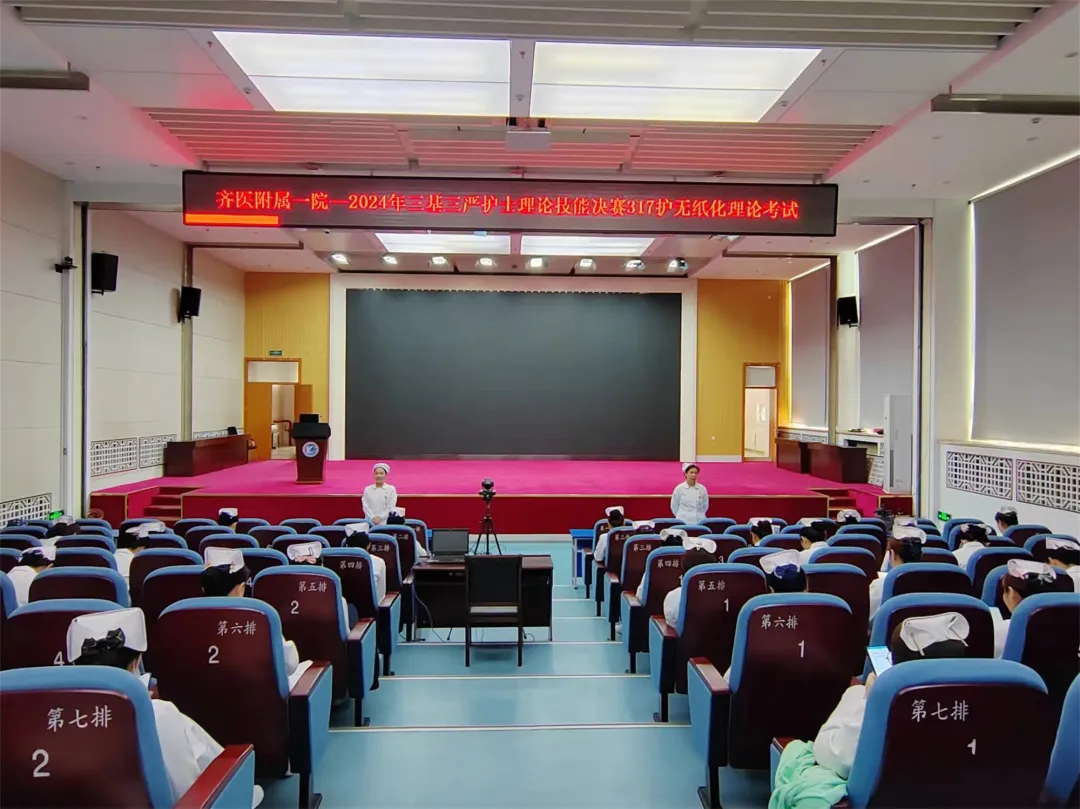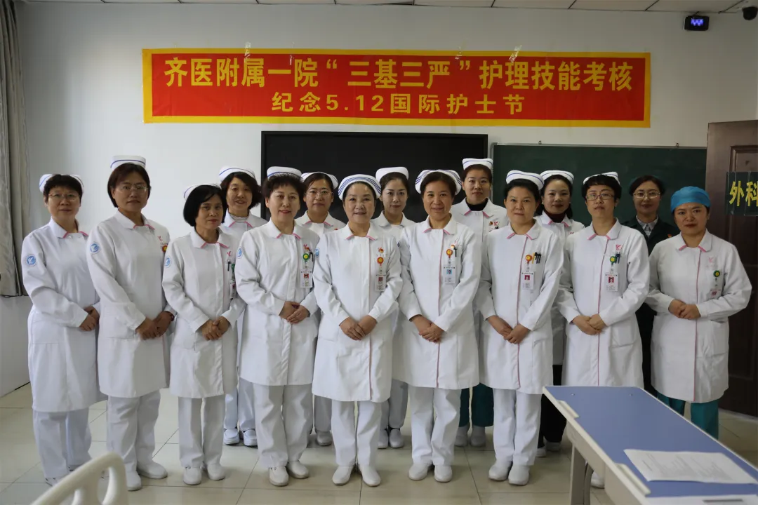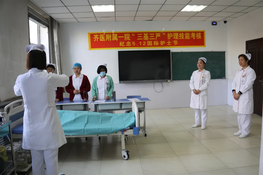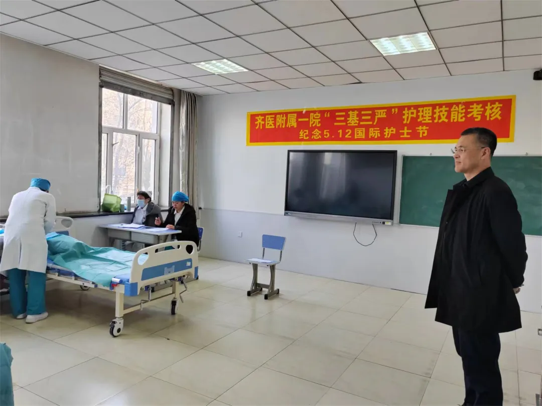 为进一步落实《齐齐哈尔医学院附属第一医院进一步改善护理服务攻坚行动计划工作方案(2024-2025年)》,推进三甲医院等级评审准备工作,助力我院高质量发展,加强护理安全管理,规范护理行为,全面提升全院护理人员综合素质、应急处理能力,4月10日,护理部组织全院316名45周岁以下护理人员,在技能中心分时段进行“三基三严”护理技能考核,考核合格率为100%,43名护理人员晋级4月16日的决赛。副院长刘增良到决赛现场观摩比赛。