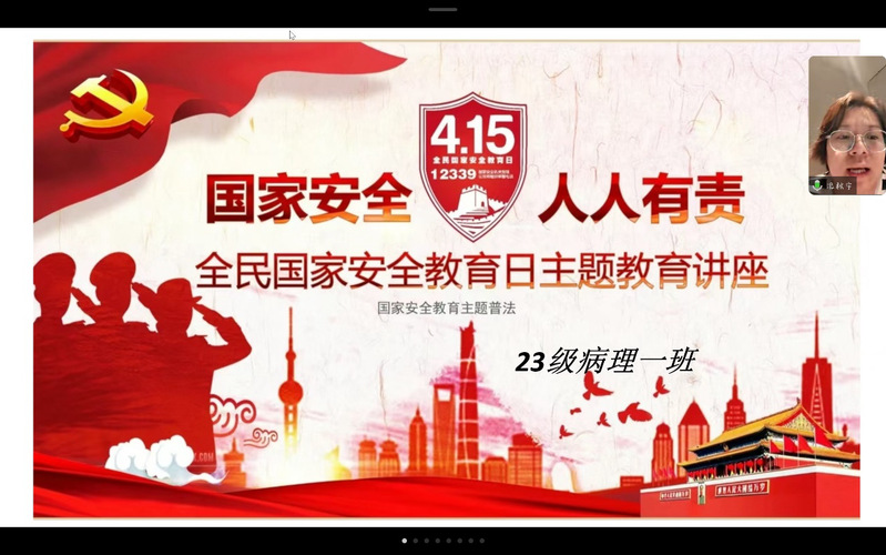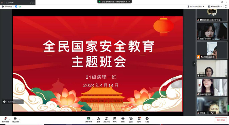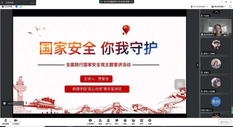 4月14日,病理学院团总支邀请青年宣讲团的贾紫怡同学为病理学院全体学生干部线上开展“国家安全,你我守护——全面践行国家安全观”主题宣讲活动。