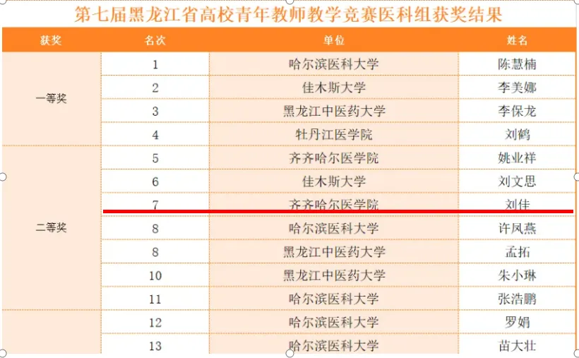 4月19日-21日,由黑龙江省总工会、省教育厅主办,省教科文卫体工会、哈尔滨师范大学承办的第七届黑龙江省高校青年教师教学竞赛在哈尔滨师范大学举行,来自全省37所高校及附属医院的159位优秀青年教师在文科、理科、工科、医科、思想政治课专项5个组别展开激烈角逐。我院护理教研室刘佳,荣获医科组二等奖的好成绩。