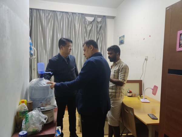 5月5日晚,国际教育学院院长王敬春带领全体留管辅导员对留学生公寓进行了全方位检查,强调严禁使用违规电器,并反复叮嘱留学生要提高安全防范意识,防溺水,防电信诈骗,严格遵守学校相关管理规定。