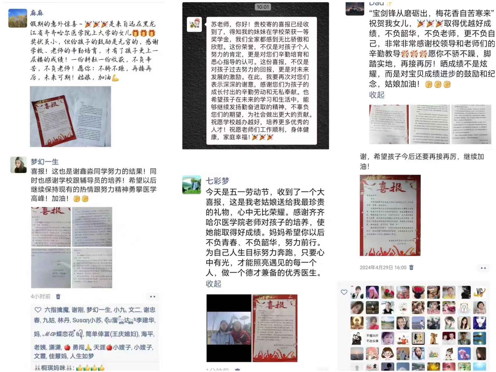 通过“喜报”到家活动与家长共同见证学生成长过程中的收获与喜悦。当家长收到喜报时,他们纷纷在家族群、朋友圈分享,表达着喜悦与自豪,基础医学院也将以此次活动为契机,进一步加强学风建设,致力于培养有理想、敢担当、能吃苦、肯奋斗的时代新人。