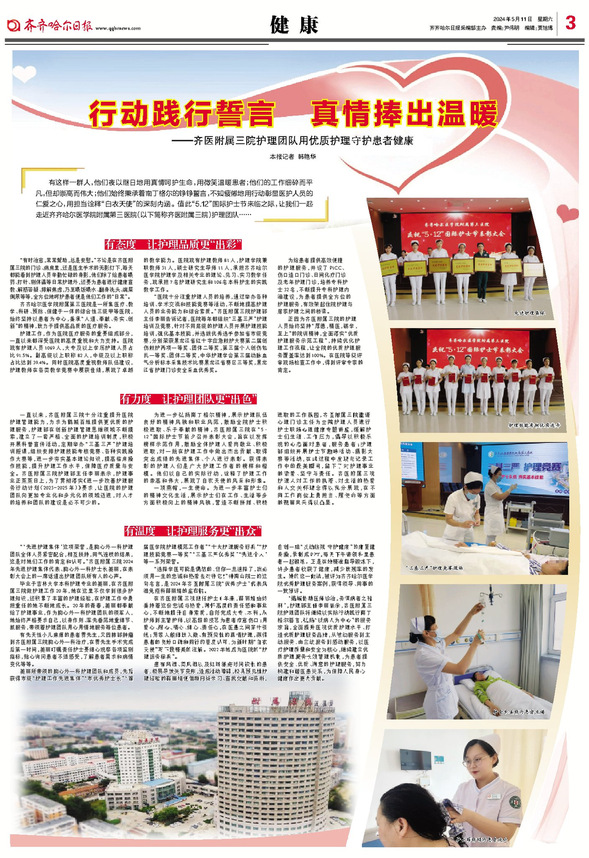 有这样一群人,他们夜以继日地用真情呵护生命,用微笑温暖患者;他们的工作细碎而平凡,但却崇高而伟大;他们始终秉承着南丁格尔的铮铮誓言,不知疲倦地用行动彰显医护人员的仁爱之心,用担当诠释“白衣天使”的深刻内涵。让我们一起走近齐齐哈尔医学院附属第三医院(以下简称“齐医附属三院)护理团队……