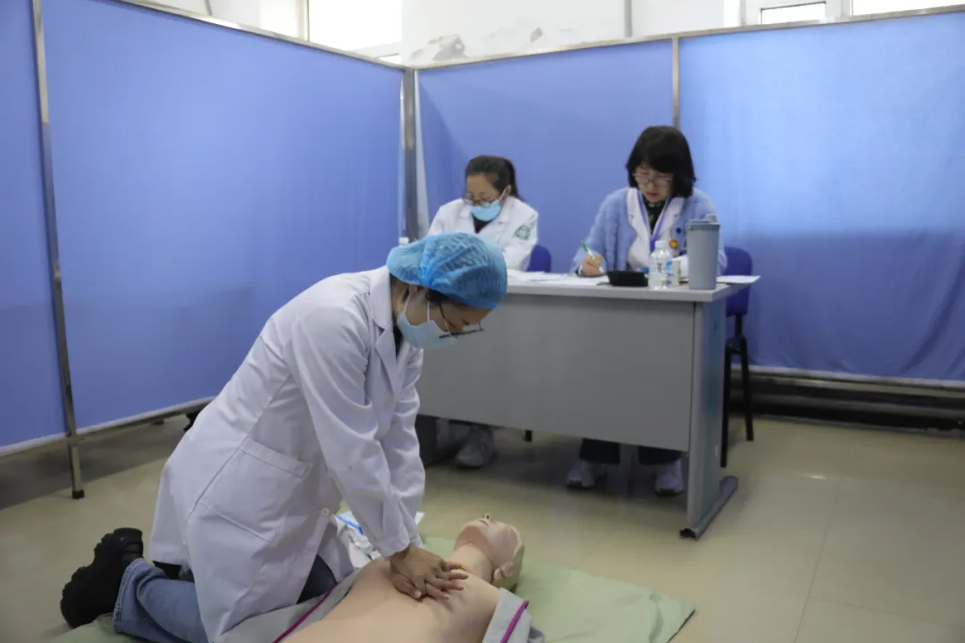 本次考试分为理论考试和技能考试两个部分。5月17日,学生们到齐齐哈尔医学院、齐齐哈尔大学参加机考形式的综合理论考试,主要考查学生的基本理论知识,涉及基础医学、医学人文、预防医学和临床医学知识点。5月18日至19日为实践技能操作考试,医院在东西区临床技能中心共设置5个考组,每个考组6个考站,采取客观结构化临床考试模式,分别考查病史采集、体格检查和临床基本操作能力。其中,第一、二站病史采集中使用“标准化病人(Standardized Patients,SP)”,第三、四站体格检查中使用“标准体检者”,第五站考察学生心肺复苏技能,第六站考察学生包括手术刷手法、静脉穿刺采血等9项基本操作。对学生各项临床技能操作能力、临床综合思维能力、人文关怀和交流沟通能力等进行全方位的考核。
