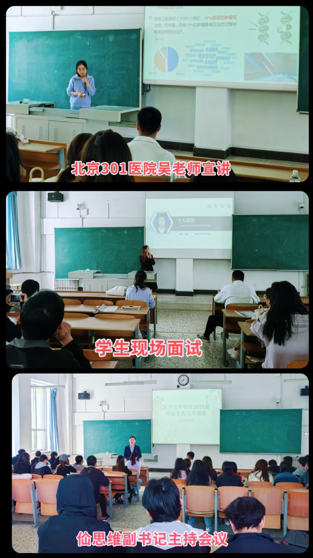 宣讲会上,两位老师全面细致介绍了医院放射科医疗设备、人员结构和科研能力等情况,并就同学们关心的住宿条件、学习环境和餐饮情况做了详细介绍。医学技术学院学工办组织4名学生参加现场面试,北京301医院的两位老师对面试学生的表现给予充分肯定。