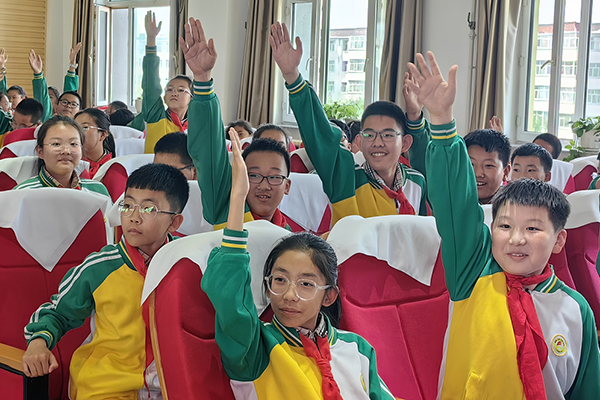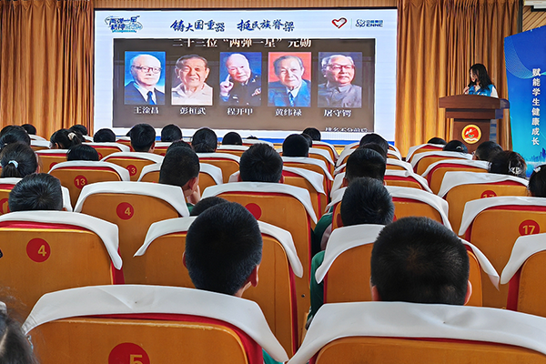 “两弹一星是什么”“井冈山在哪个省份”“中国第一颗原子弹爆炸成功是哪一年”,宣讲团成员韩宇彤、蔡欣禹辰在讲台上接连抛出问题,小学生们争先恐后举起小手,从座位上站起来争相抢答问题,宣讲团的大姐姐们则为回答正确的小学生送上了“两弹一星”明信片并盖上专属印章。在有趣热烈、活跃和谐的氛围中,心火宣讲团成员通过大量珍贵的历史图片、丰富的影像资料、生动的故事讲述,带领同学们穿越时空,亲身感受那段波澜壮阔的历史,将“两弹一星”精神、井冈山精神深深印在小学生的心中,在他们心中播下了“强国复兴有我”的种子。